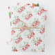 Santa Baby shower bow and Santa hat Christmas Wrapping Paper Sheets. The first sheet features the text "Santa Baby" in script and decorative fonts. The second showcases a pattern of Santa hats, and the third a pattern of red and green coquette bow. Snowflakes cover all three sheets over the graphics.