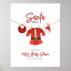 Christmas baby shower theme featuring baby santa suit dress on clothesline with santa hat and red bib.