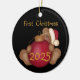 Baby's first Christmas keepsake ornament featuring a teddy bear in a red stocking cap holding a big red tree ball! You can add baby's name, date and time of birth, height and weight, and the current year to this fully customisable keepsake holiday ornament.