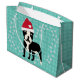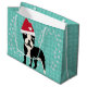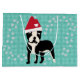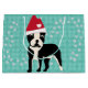 This fun, cute cartoon style black and white Boston Terrier dog stands happily while wearing a Santa hat. Design by Diane Blackman