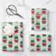 Novelty Christmas wrapping paper sheets with a pattern of cacti in Santa outfits on a green background.
