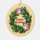 This unique customisable baseball themed Christmas ornament features illustrations of an evergreen holiday wreath with Santa capped baseballs. Customisable "Season's Greetings" message in centre and room on the back to add your own personalised holiday message for family, teammates, customers and more.