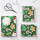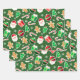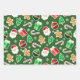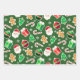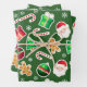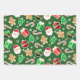 Dark green background with pictures of Santa, candy canes, gingerbread cookies, snowflakes, Christmas trees, and presents that look like they are stickers. Fun paper for children or adults.