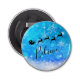 Christmas bottle opener with a black silhouette of Santa riding in his sleigh being pulled by his reindeer flying across the sky. Believe written in a trendy script font. The background is an icy blue frosty snowflake design.