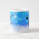 Christmas jumbo mug with a black silhouette of Santa riding in his sleigh being pulled by his reindeer flying across the sky. Believe written in a trendy script font. The background is an icy blue frosty snowflake design.