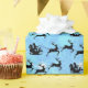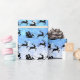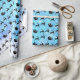 Wrapping paper with a christmas pattern. Illustrated with a black silhouette of santa riding in his sleigh being pulled by his reindeer flying across the sky. The background is an icy blue frosty snowflake design.