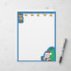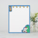 This cartoon letterhead features a reindeer and five gold bells across the top, Santa Claus sitting with a big bag of toys in the bottom right corner, and a blue border.