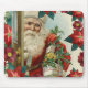 Vintage illustration of Santa Claus bringing gifts and presents for Christmas, decorated with holly berries and poinsettias.