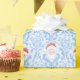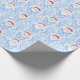 This Christmas wrap has a blue damask pattern featuring Santa in the center.