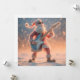 A fun, whimsical, and highly detailed photograph or 3D render featuring a stylized, fuzzy figure of Santa Claus dressed in his traditional red and white suit. Santa is wearing dark sunglasses and strikes a dramatic rock-and-roll pose while enthusiastically playing a bright light-blue and white electric guitar. The scene is set outdoors in a heavy snow flurry, with large, soft snowflakes falling around him. The background is blurred with a warm, golden-orange light emanating from the horizon.