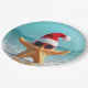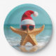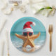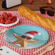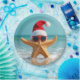A starfish wearing a Santa hat and red sunglasses stands upright on a sandy beach in ocean surf