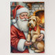 A charming holiday scene featuring Santa Claus holding a cheerful Airedale Terrier in his arms. This festive artwork captures the breed’s intelligent expression, wiry coat, and lively personality, perfectly blending warmth and Christmas joy. A wonderful piece for Airedale lovers and dog enthusiasts who enjoy celebrating the holiday season with their loyal companions.
