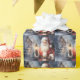 Pretty wrapping paper with an image of Santa Claus holding a lantern, standing in front of a home he just delivered gifts to