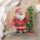 Santa Claus joyfully holding a gift and surrounded by decorated Christmas tree. The festive scene illustrates celebration, joy, and holiday spirit.