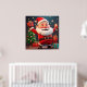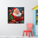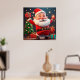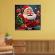 Santa Claus joyfully holding a gift and surrounded by decorated Christmas tree. The festive scene illustrates celebration, joy, and holiday spirit.