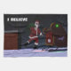 Do you believe in Santa Claus? Features Santa Claus on the roof of a house after delivering presents. Customisable text reading "I BELIEVE" also appears.