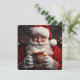 This Christmas greeting card features jolly Santa Claus smiling with a holiday mug during Christmas. The back is blank and cream colour to include a greeting.