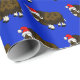 A drawing of a cute cartoon musk ox wearing a Santa Claus hat.