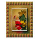 The artwork features Santa Claus climbing a Christmas tree with golden bells and a golden bow at the top. It is a beautiful vintage piece of art presented on a golden background and framed with an elegant motif pattern of the photo. Travel back in time and enjoy the vintage-inspired art.
