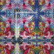 Colourful, whimsical and artistic acrylic painting ,Santa is playing harp in the moonlight ,an owl ,floral ornaments,winter plants,children toys,holly berries in bright red,green,white,blue,yellow colours. by Bulgan Lumini (c)