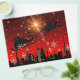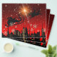 Santa Claus with his Reindeer flying in a sleigh over the city. Red night sky and snowflakes. frontiernow.com