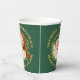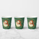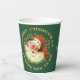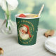 These Christmas paper cups feature a wonderful retro portrait of Santa Claus surrounded by holly sprigs. He is framed with gold curved text that says "Merry Christmas" and "Happy New Year". The image is printed twice on the cups, and your custom text is in white at the centre. Everything is placed on a Holiday green background.