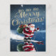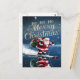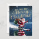 Santa Claus gracefully glides down a snowy slope on skis, spreading Christmas joy along the way with a festive card in hand.