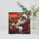 Amusing Christmas card featuring a sleeping Santa Claus holding a gift in his hands. Cute lettering in white “Merry Christmas” with a small personalizable phrase. Design on square flat card with text in back of the card.