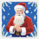 Cheerful Santa Claus in traditional red attire surrounded by a winter-themed background featuring snowflakes and pine branches. Perfect for holidays and Christmas-themed designs.