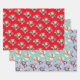 Three sheets of wrapping paper with three different cute complementary Christmas designs. A red Santa Claus repeating pattern, is paired with a lavender Snowman repeating design and a mint Reindeer repeating pattern. Great for children and adults alike!