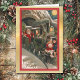 The front of this Holiday greeting card features a vintage fine art image of Santa Claus driving a train through a tunnel with two children as passengers, and a full bright moon in the sky. The image is placed on a light infused gold gradient background, and is bordered in red with a thin gold line.. The inside of the card has the gold background on the left and the other side is white, and partially left blank for your own message, with custom text fields for your signature at the bottom. Celebrate Christmas the old fashioned way with this beautiful card showcasing an image from days gone by.