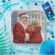 Trump dressed as Santa Claus holds a large sack filled with wrapped gifts standing in front of a snowy White House
