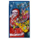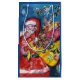 Colourful, whimsical and artistic acrylic painting ,Santa in the snowy winter night ,snowflakes ,toys, ornaments,winter plants, holly berries in bright red,green,white,blue,yellow colours. by Bulgan Lumini (c)