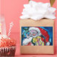 Colourful, whimsical and artistic acrylic painting ,Santa is playing violin in the snowy winter night ,an owl ,floral ornaments,winter plants, holly berries in bright red,green,white,blue,yellow colours.