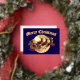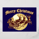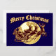 Santa Clause in sleigh pulled by reindeer flying in front of a full moon in a retro woodcut style. You can easily personalize the text and customize the background color with this Christmas card template.