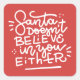 Bring a touch of humour to your holiday decor with this playful design featuring the phrase "Santa Doesn’t Believe in You Either." Perfect for those who love a bit of cheeky fun, this graphic can be applied to a variety of products, making it an ideal gift or decorative piece for the festive season.