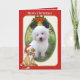 Fun pet card features a tan and white dog wearing a Santa Claus hat and holding a candy cane from Santa Claus in his mouth. Gold Bell and bow above.This photo card is ready to be customised with your pets photo or person with their pet. Customise inside text and keep or change message too.