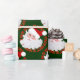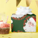 Santa Face Circles-Santa's sporting is red Santa hat and gold glitter glasses. Red and gold text circles around and reads: Ho Ho Ho, Merry Christmas! The background is solid green. This Santa wrapping is available with assorted background colours. It's also available as an allover Santa without the circled text.