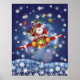 Christmas Santa Claus with Reindeer Flying a Festive Decorated Old Antique Vintage Classic Propeller Aeroplane Delivering Boxes of Gift Wrapped Presents on a Blue Snowing Night Background Drawing Illustration