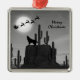 This Merry Christmas ornament features a silhouette wolf howling at the full moon with Santa flying his sleigh. The background is a southwestern desert scene with cacti.