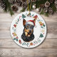 Here's a cute personalised ornament for anyone who loves an Australian Kelpie Dog. The front has an adorable black and tan Kelpie wearing a Santa hat. The image is framed within a colourful circle wreath made up of various Holiday images, including a snowman, bells, candy cane, stocking, holly, and more! The back of the ornament has the same wreath image with a Christmas and New Year's greeting. Be sure to update the custom text field for the appropriate year!