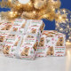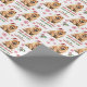 The repeated pattern on this Christmas wrapping paper includes an image of a beautiful Chow Chow dog wearing a red Santa hat. Red and green text says MERRY CHRISTMAS", and "Happy New Year" with your custom signature below. Other images included in the pattern include red decorative snowflakes and candy canes.