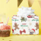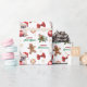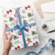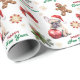 The repeated pattern on this Christmas wrapping paper includes an image of an adorable French Bulldog wearing a red and white Santa Claus hat. He is resting one paw on a red Holiday tree bulb. Also included in the pattern is a gingerbread man, a red bow, a holly sprig with red berries, and varied sizes of ornate gold snowflakes. Stylized red and green text says MERRY CHRISTMAS" and "HAPPY NEW YEAR". Be sure to see the matching gift tags in our store.
