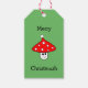 Say it with mushrooms with these festive fungus gift tags. The mushroom has a red cap like a Santa hat and a smiley face. The background is light green.