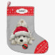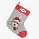 The front of this Holiday stocking shows an image of an adorable West Highland White Terrier dog wearing a Santa hat. The Westie wants to play, and has discovered a Santa Claus belt tree bulb. The image is placed on a silver grey background, and the toe and top border are a red and white snowflake pattern. On the top border is a white label with your custom text in dark grey. The back of the stocking is the same red and white snowflake pattern.