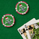 These poker chips have a silly skeleton holding red and green ornaments up to his eyes wearing a red Santa Claus hat trimmed in fur on a green background with faux gold sparkles on the front and back.