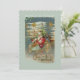 Here comes Santa! He is steering his amazing flying machine through the night sky. Stars, streamers and fancy decorations bedeck the aircraft and its load of wonderful toys for Christmas morning. The restored image of a Victorian postcard features a frosty background, gold accents and beautiful, bright colours. It is framed in icicles and ornaments with a Christmas village in the background.