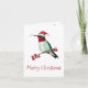 Cute Christmas card featuring a hand-painted ruby-throated hummingbird wearing a Santa hat on a white background.