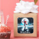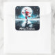 In a festive winter scene, Santa Claus gracefully ice skates across a shimmering rink illuminated by a bright full moon. The atmosphere radiates holiday cheer, with a beautiful winter landscape and a cheerful Merry Christmas greeting below.