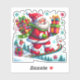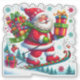 In a winter wonderland, Santa gleefully skis down a snowy slope, arms full of beautifully wrapped presents. Colourful gifts are strapped to his back, and cheerful snowflakes swirl around him, embodying the spirit of the holiday season and merriment.